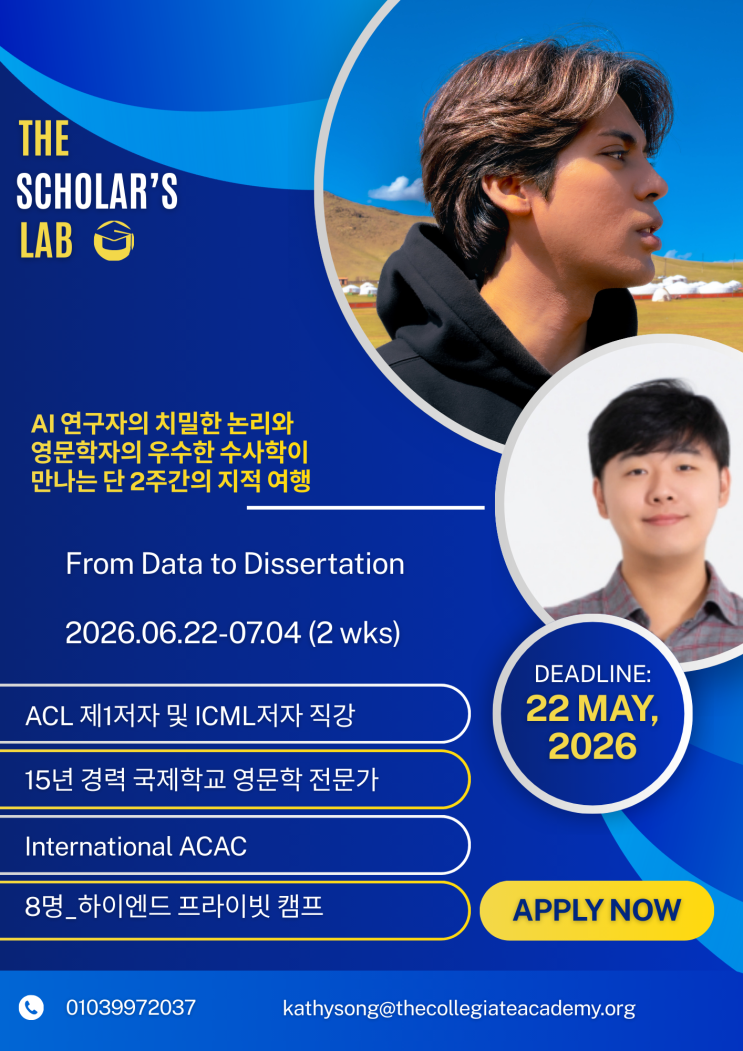 10일간, 세계적인 연구자들과 함께 '생각하는 법'을 바꿉니다. 하지만 입시는 '과정'이 아닌 **'증명된 결과물'**로 말합니다. ACL/ICML 저자가 직접 리뷰하는 리서치 논문, 15년 경력의 베테랑이 빚어내는 독보적인 보이스. 캠프에서 발견한 아이의 잠재력을 합격 통지서로 바꾸는 마지막 퍼즐을 맞출 준비가 되셨나요? 대상: 학문적 성취를 갈망하는 고등학생 (선착순 8인_4월 1일부터 신청 가능) 신청방법: 추후 웹사이트를 통한 지원 (선착순 & 인터뷰 통과 학생에 한해) 장소: 강남 프라이빗 컨설팅 스튜디오 (삼성역/강남역 인근) <img src="https://blogthumb.pstatic.net/MjAyNjAzMDNfMjA2/MDAxNzcyNTAwNjM5MDk5.1twiU_FNgFGk7H8q1XSEoKGShe4fgnCvbAHgMXOHFWkg.GrOIg-ZK2ln_1gt2biEtCBwv2Hzxjl1WOMnPO8fDB70g.PNG/2.png?type=s3" />