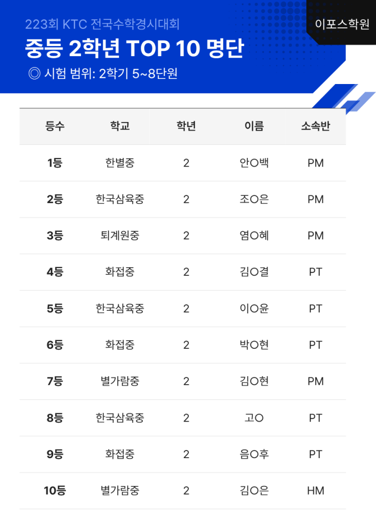 223회 KTC 전국수학경시대회 TOP 10 명단