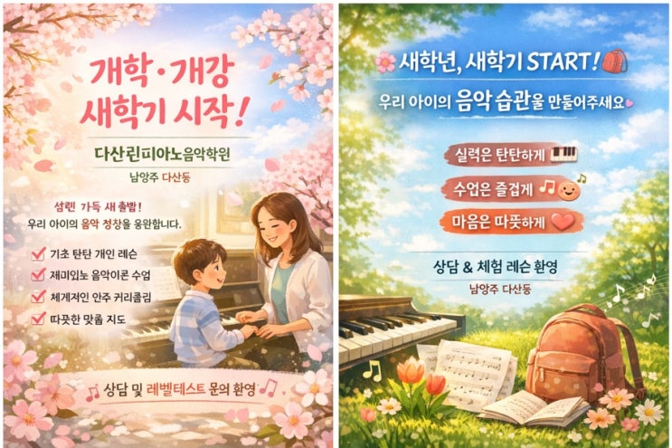 남양주 다산동에서 아이들의 음악 성장을 함께하는 다산린피아노음악학원입니다. 긴 방학이 지나고 설렘 가득한 새학기가 시작되었어요. 새 교실, 새 친구들, 그리고 새로운 목표들✨ 새로운 시작은 늘 작은 결심에서부터 시작됩니다. 올해는 우리 아이에게 “꾸준함”이라는 선물을 해보는 건 어떨까요? 다산린피아노는 ✔ 기초를 탄탄하게 다지는 개인 맞춤 레슨 ✔ 재미있게 배우는 음악이론 수업 ✔ 연주력과 표현력을 함께 키우는 체계적인 커리큘럼 ✔ 아이의 자존감을 키워주는 따뜻한 지도 단순히 피아노를 치는 시간이 아니라 아이 스스로 해냈다는 성취감을 느끼는 시간이 되도록 지도하고 있습니다. 새학기, 새로운 도전! 음악으....... <img src="https://blogthumb.pstatic.net/MjAyNjAzMDNfNTMg/MDAxNzcyNDk3NTEyOTIy.D232ySQ9uffVPrJPVN2cCPXkW_mj8FsT_nMixQK8ujAg.1bSm-HqV_318Pu4lfwcCKQM1LE7TqdIqhjNSNIUzff0g.JPEG/39D875CB%A3%ADC46D%A3%AD4C99%A3%ADB4F9%A3%AD0434D74E71C3.jpg?type=s3" />