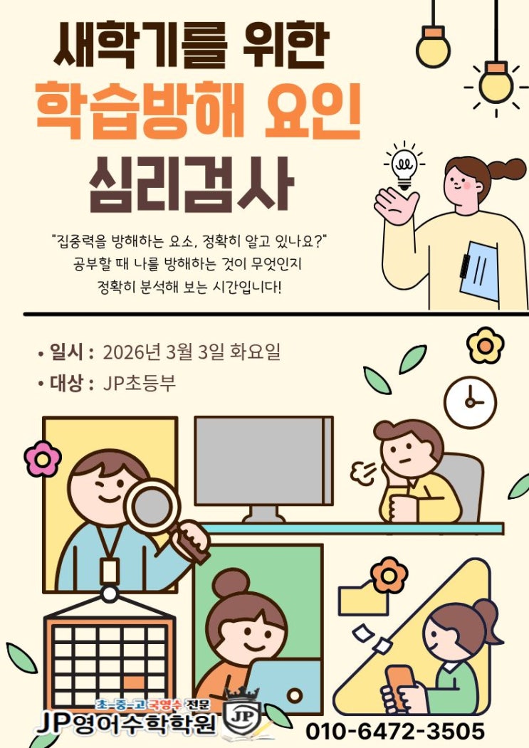 안녕하세요. 지금 필요한 우리들의 학원! jp학원입니다. 드디어 오늘, 설레는 3월 새 학기가 시작되었네요! 우리 학생들, 새로운 교실과 친구들 사이에서 기분 좋은 긴장감을 느꼈을 하루였을 것 같아요. 그런데 이맘때면 우리 학생들 마음 한구석에는 이런 고민이 피어오르곤 합니다. “이번 학기에는 정말 잘하고 싶은데, 왜 자꾸 딴짓을 하게 될까?”, “나는 왜 책상 앞에만 앉으면 집중력이 흐트러지는 걸까?” 등등 사실 공부를 잘하고 싶은 마음은 누구나 간절합니다. 하지만 우리 주변에는 그 마음을 방해하는 요소들이 참 많아요. 핸드폰 게임일 수도 있고, 부족한 잠이나 어수선한 방 분위기일 수도 있죠. 때로는 "내가 잘할 수 있....... <img src="https://blogthumb.pstatic.net/MjAyNjAzMDNfNiAg/MDAxNzcyNTI0Mjc0Nzcw.VbsKMBp5_WiqAuxv3zQR4RoMm2obfzKsqLhmX0SMRkUg.vk9Na33d1ZhKOvwa3K_J-pE6DYJ27izQmldzx1osDfMg.JPEG/%C1%A6%B8%F1%C0%BB_%C0%D4%B7%C2%C7%D8%C1%D6%BC%BC%BF%E4._-_2026-03-03T121358.708.jpg?type=s3" />