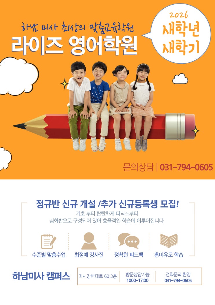 안녕하세요! 하남 미사 영어 학원 라이즈 어학원입니다^^ 긴 겨울이 지나고, 드디어 3월 신학기가 시작되었습니다. 특히 이 시기는 초등 영어에 대한 첫 인상이 만들어지는 아주 중요한 시기입니다. 이 시기에 *영어가 재미있다고 느끼는지 *말하는 것을 부끄러워하지 않는지 *알파벳과 파닉스를 제대로 익히는지 에 따라 앞으로의 영어 학습 태도가 달라집니다 라이즈 어학원은 또한 영어를 "공부" 가 아닌 "익순한 친구" 처럼 느끼도록 돕겠습니다. 추가로 저학년 신규반 추가로 개설 합니다. #하남미사 에서 초등영어학원을 찾고 계신 학부모님 #파닉스 가 아직 학습이 안된 학생 #영어 자신감이 필요한 학생 편하게 상담....... <img src="https://blogthumb.pstatic.net/MjAyNjAzMDVfMTIw/MDAxNzcyNjYxNzA3MTg5.tJqEU3v1ySfV1uaAT4uTBjoV8-Og-gpTeJ1rRNOhPj0g.l0nx2_scXIfu-kd2_sjNZ4HXKEd_UzHx-xpK-3eT9r0g.JPEG/001.jpg?type=s3" />