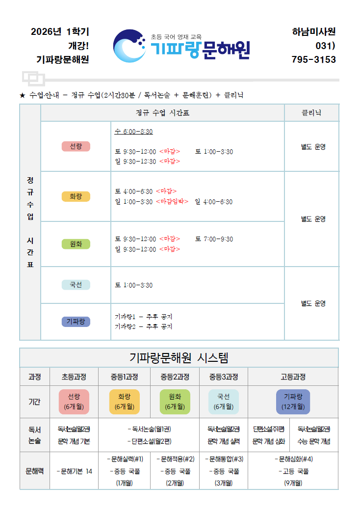 2026년 1학기 기파랑문해원 하남미사원 수업 시간표입니다 <26년 3월 현재> --------------------- < 26년 3월, 현재 시간표 현황입니다 > - 일부 반은 사전에 마감될 수 있으며, 마감반의 경우 학습대기 접수를 받습니다. <img src="https://blogthumb.pstatic.net/MjAyNjAzMDVfNjUg/MDAxNzcyNjczMjcyMDYy.olxyqQkhD09D4jw4lO6v8EIMG3z39pQ_4ibSzDoAafkg.CbjBLrQ1k8HDLgQPyA3c7LT8sUEoXFcirHfQ_0D_HAYg.PNG/20260304_230401.png?type=s3" />