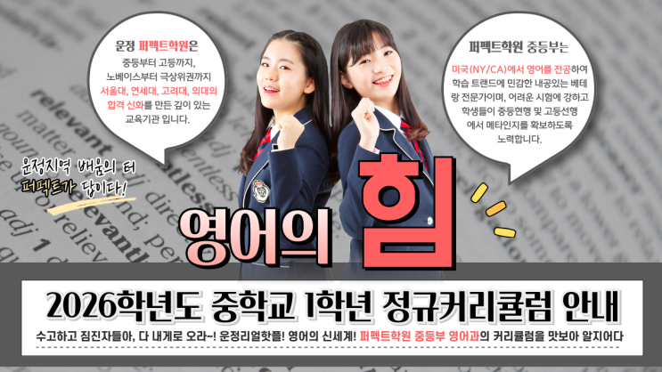 안녕하세요. 퍼펙트학원 중등부 영어과입니다. 중학교 영어 학습 방향에 대해 고민하시는 학부모님들이 많아, 중학교 1학년 영어 학습 구조와 커리큘럼 설계 기준을 설명드리는 영상을 제작하게 되었습니다. 이번 영상은 2026학년도 중학교 1학년 3월~5월 커리큘럼 운영 기준을 중심으로, 중등 영어 학습을 어떤 구조로 설계하고 운영하는지에 대해 비교적 구체적으로 설명드리는 내용입니다. 많은 학부모님들께서 "특정 학교의 학습분위기가 좋지 않다던데...우리 아이는 괜찮을련지", “초등 영어를 꾸준히 했는데 중학교에서도 이어질 수 있을까?”, “중학교 영어는 무엇을 기준으로 준비해야 할까?”, “지금 학습 방향이 맞는지....... <img src="https://blogthumb.pstatic.net/MjAyNjAzMDVfMjgy/MDAxNzcyNjk3OTYyODc3.Y5n38QUAuPQyTKHWz6ynui2iXtWWtPkavjsVioTMVMsg.CyPh8Z27sknebHJUTtU-Uzi5va46_DJELe82AoQRLyEg.PNG/%C1%A6%B8%F1%C0%BB-%C0%D4%B7%C2%C7%D8%C1%D6%BC%BC%BF%E4_-001_%281%29.png?type=s3" />