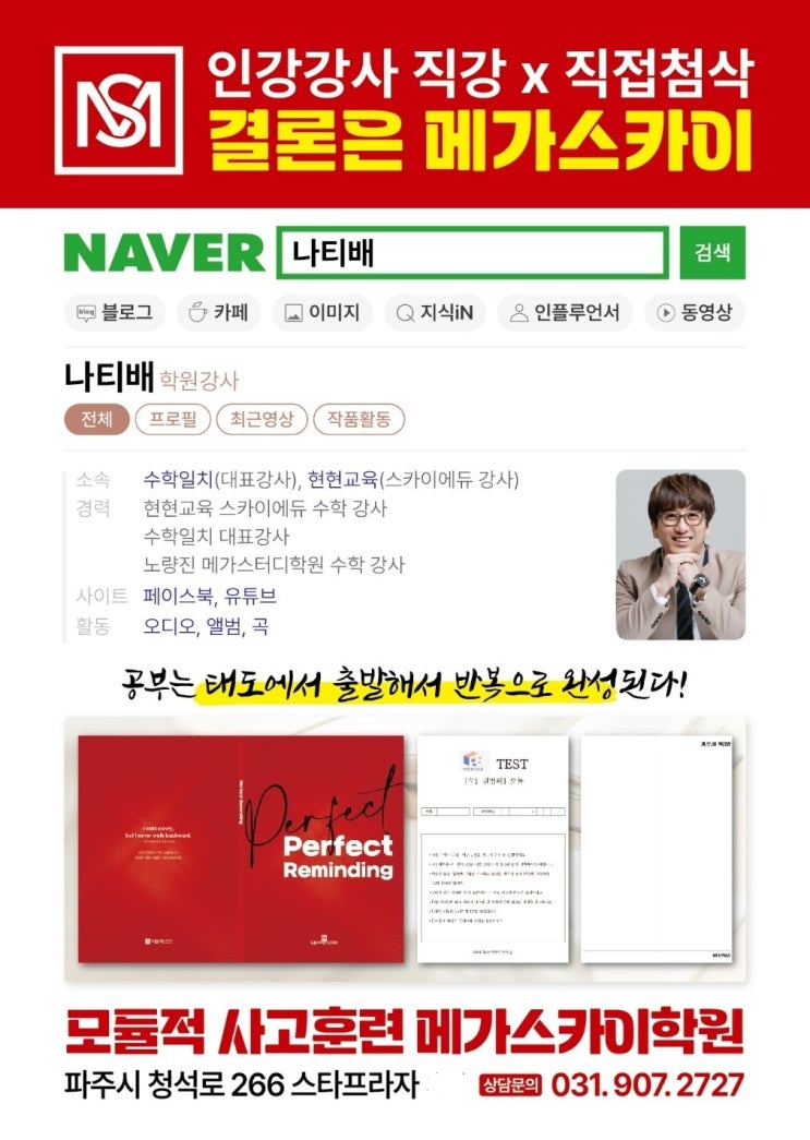 운정 교하 수학학원 메가스카이의 나티배 수학쌤입니다. 학부모님들과 상담을 하다보면 이런 질문을 많이 받습니다. "원장님은 댁에 계신 자녀 분 공부, 어떻게 시키세요?" 저는 조금은 자랑스럽게 대답합니다. "우리 아이들의 수학은 제가 직접 가르칩니다." 부모가 자식을 직접 가르치는 것은 가능하면 피하라는 선배 강사들의 조언에도 제가 제 아이들의 수학을 직접 가르치는 것에는 이유가 있습니다. 아이들이 어렸을 때 저는 하루도 쉬지 않고 일주일에 5개 학원을 출강했습니다. 더 나은 미래를 위해 그게 정답이라고 믿고 쉬지 않고 달렸습니다. 그러던 어느 날 훌쩍 자란 아이들이 보였습니다. 저는 부모가 자녀에....... <img src="https://blogthumb.pstatic.net/MjAyNjAzMDlfMTk2/MDAxNzczMDI3ODUxOTI1.iaxPBigDpHIVQamESVxxdZ2x63cLIGIBOGtoN3cC6mUg.AM7qXAcQiH0aY7Mc0ZeG0Jcd3gRTswO5JwxPoMX0Kmwg.JPEG/%B3%AA%C6%BC%B9%E8_%B1%A4%B0%ED.jpg?type=s3" />