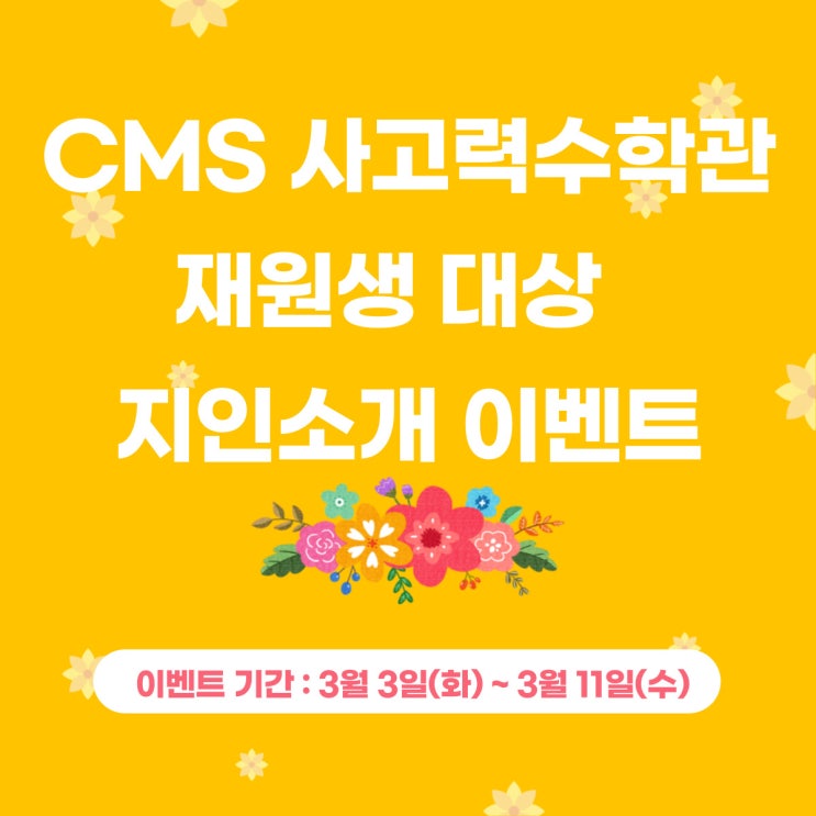 안녕하세요. CMS성동 사고력 수학관 성동쌤 이에요 새 학기를 맞아 CMS 사고력관을 믿고 보내주시는 학부모님께 감사한 마음을 담아 지인소개 이벤트를 준비했습니다. 소개 시켜준 나도! 소개 받은 친구도!! 모두 혜택을 누릴 수 있는 지인소개 할인 이벤트!! 지금 바로 확인해 보세요. ️이벤트 기간 : 3월 3일(화) ~ 3월 11일(수) 단 9일간 진행 되니 기간을 꼭 확인해 주세요! 신청 링크 : 지인 소개 할인 이벤트 참여(추천인용) 풍성한 혜택 안내 이번 이벤트는 두가지 단계로 혜택을 드립니다. 1.입학고사 응시만 해도? -혜택 : 메가커피 쿠폰 증정 -대상 : 소개 받은 친구가 입학고사에 응시할 경우 -응시 기간 : ~3월 14일(토) 까....... <img src="https://blogthumb.pstatic.net/MjAyNjAzMDNfMjY1/MDAxNzcyNTE1NjUyOTU4.ohgucGa3i7GE5Am-CxP9leXX5rSLHH2oyH5PNSoblTgg.mIxo9clOuq1Sh6-OwQWYI34SFJs5JSdTrRdckmXUiCUg.JPEG/%C1%A6%B8%F1%C0%BB-%C0%D4%B7%C2%C7%D8%C1%D6%BC%BC%BF%E4_-001_%2868%29.jpg?type=s3" />