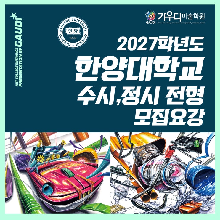 2027학년도 한양대 미대입시 수시/정시 안녕하세요~~ 미대입시 전문 종로미술학원 성북 가우디미술학원입니다. 2027학년도 미대입시를 준비할 시기가 다가왔네요. 한양대학교 미대입시를 이해하기 쉽게 정리를 했으니 한양대가 목표인 학생들은 꼭 끝까지 읽어봐주세요~~ 한양대학교 미대입시 수시모집 서울캠퍼스 응용미술교육과는 수시전형으로 실기실적22명 선발하며, 정시전형은 선발하지 않습니다. 종로미술학원 성북가우디에서는 한양대 미대입시의 모집인원이 적기 때문에 최대한의 준비와 전략이 매우 중요한 학과라 생각하고 준비를 진행 하고 있습니다. 에리카캠퍼스 디자인계열 학과는 수시전형 서류형으로 17명 선발하고, 실기실적으....... <img src="https://blogthumb.pstatic.net/MjAyNjAyMjZfNjIg/MDAxNzcyMDk4NTkzMDEz.rHfurh2rEdIaAQO7v0Cv2N3zgjdPyZPsWnYuxJtQ16gg.ceQFySYTsXYyHXMY8dRt6DkG09IzUE4fSPmrFk-zbb8g.JPEG/%C7%D1%BE%E7%B4%EB%C0%D4%BD%C3%C0%FC%C7%FC-1.jpg?type=s3" />
