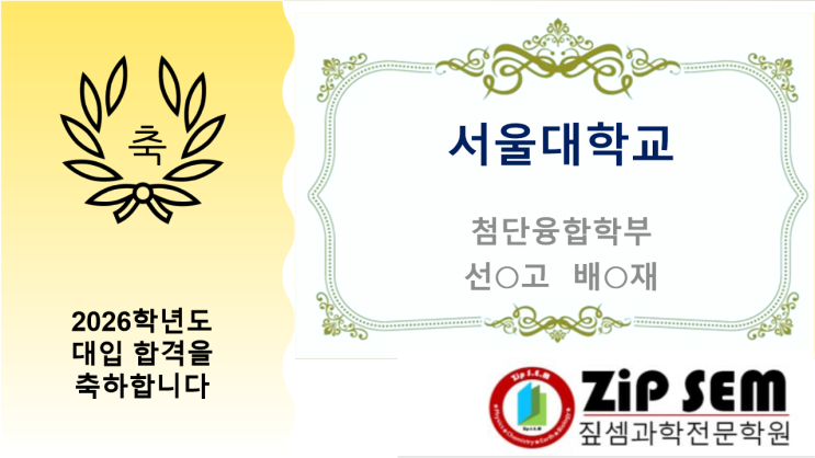 선○고 배○재학생의 <<서울대학교>> 합격을 진심으로 축하합니다. 그동안 아낌 없는 지원과 격려해주신 부모님께도 축하와 감사인사 전합니다. 새로운 출발선에 서게 될 예비 고3 학생들에게도 강력한 합격 에너지를 전합니다. #서울대#첨단융합학부 #고3 #수능 #합격자발표 #대학발표 #짚셈과학전문학원 #연신내역 #구산역 #대입 #입시 #입시변화 #정시 #수시 #대학 #대성고 #선일여고 #선정고 #명지고 #충암고 #동명여고 #신도고 #진관고 #숭실고 #예일여고 #중앙고 #과학학원 #은평구과학학원 #갈현동과학학원 #짚셈 #집셈 #은평구과학 #은평구 #수능 #내신 #논술 #학종 #중간고사 #기말고사 #모의고사 #내신대비 #방학특강 #화....... <img src="https://blogthumb.pstatic.net/MjAyNjAzMDJfMTU1/MDAxNzcyNDM2MDI0ODQ4.W7M-iRtji0KTEE34ddUF0GIwPqj6D1kRlh-Gp2pkRA4g.Pko-91XNS6LPAdKss7WEMYbeW4Dfjb37nXJzujp1394g.PNG/%C7%D5%B0%DD%B9%E8%B3%CA%BF%EB202606.png?type=s3" />