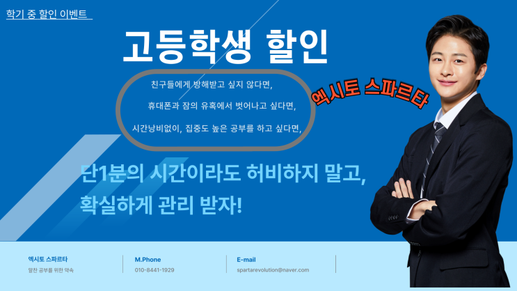 힘든 경제 상황에 조금이나마 서로 고통을 분담하자는 차원에서 학기 중인 학생들의 독서실 비 할인 행사를 합니다. 엑시토 스파르타는 대입 수능을 앞두고 알찬 계획으로 공부에 매진하고자 하는 학생들이 남들에게 방해받지 않고, 졸거나 멍하니 있거나 인터넷의 유혹에 빠지지 않고, 착실히 시간을 활용할 수 있는 심도 있는 공간을 제공합니다. 관리자가 상주하여 밀착 관리하며, 학습 공간 청결관리부터, 차분한 학습 분위기 연출, 엄격한 학습관리까지 학생 본인뿐만 아니라, 부모님들께서도 자녀를 믿고 맡길 수 있는 곳 엑시토 스파르타입니다. #1 <img src="https://blogthumb.pstatic.net/MjAyNjAzMDRfMjcx/MDAxNzcyNjI0MDI1ODI5.0pr0dnj8J8hLHqDbQwXf1HHnx6nbpLILu9HrnJcQyJcg.K0dyeHFeve4q3p6vWiU2qjrKU90PI5do37BVQbWvbScg.PNG/%B0%ED%B5%EE%C7%D0%BB%FD-%C7%D2%C0%CE-001.png?type=s3" />