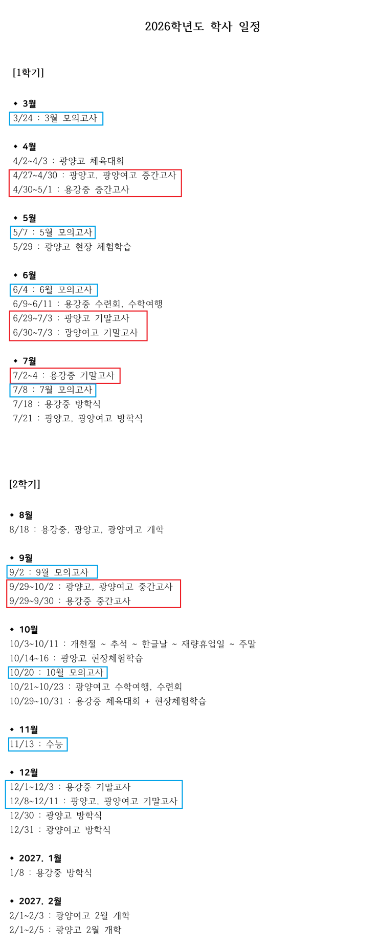 2026학년도 광양 용강중, 광양고, 광양여고 학사 일정표입니다. 필요하신 학생들과 학부모님들께 도움이 되면 좋겠습니다! <img src="https://blogthumb.pstatic.net/MjAyNjAzMDhfOTgg/MDAxNzcyOTQyOTc3ODEy.pwcTlBMEXOoULJpMKTZayMSpAb-nnQ3Hy_fAoWV-VVEg.FmnW03EYLRMiVjD0LaR-dJl3jHvDKEKqO3_tBXRAUtkg.PNG/2026%C7%D0%B3%E2%B5%B5_%BF%EB%B0%AD%C1%DF%2C_%B1%A4%BE%E7%B0%ED%2C_%B1%A4%BE%E7%BF%A9%B0%ED_%C7%D0%BB%E7_%C0%CF%C1%A4_1.png?type=s3" />