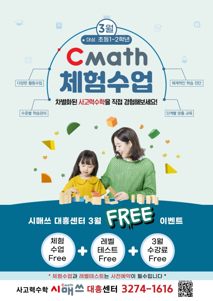 3월 사고력수학 시매쓰 무료체험수업 안내 요즘 수학, 단순 계산보다 생각하는 힘이 더 중요합니다. 3월 CMath에서는 초1~2학년을 대상으로 연령과 수준에 맞춘 사고력수학 체험수업을 진행합니다. ✔ 다양한 활동수업으로 개념 원리 체득 ✔ 토론·발표 수업으로 의사소통 능력 향상 ✔ 체계적인 학습 진단 및 레벨 테스트 ✔ 수준별 관리 & 단계별 맞춤 교육 아이들이 블록과 교구를 활용해 직접 만들고, 설명하고, 생각하며 자연스럽게 사고력을 키우는 수업입니다. ★ 3월 FREE 이벤트 ✔ 체험수업 무료 ✔ 레벨테스트 무료 ✔ 3월 수강료 무료 ※ 체험수업 및 레벨테스트는 사전예약 필수입니다. “답을 맞히는 수학”이 아니라 “답을 찾....... <img src="https://blogthumb.pstatic.net/MjAyNjAzMDNfOTQg/MDAxNzcyNTM0MjM5MDg4.oFm2rUDdvrO3fljcq8g-Q_U89LeFVNod7arRE8UWjiwg.SgSvrvJ6tqe5b-QKRGLfpN3MxfVZtbBWlUPLzAOSIRkg.JPEG/C%C3%BC%C7%E8%BC%F6%BE%F7_%282%29_1.jpg?type=s3" />