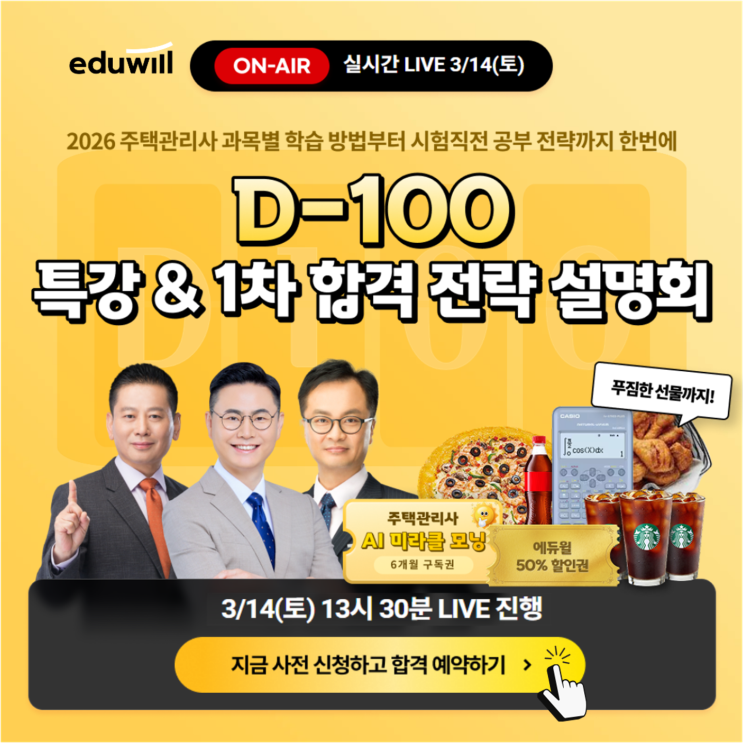 2026년 주택관리사 자격증 취득을 목표로 오늘도 뜨겁게 달리고 계신 수험생 여러분, 반갑습니다! 어느덧 1차 시험이 우리 앞으로 성큼 다가왔네요. 이제 남은 시간은 단 100일! 이 시점은 합격의 당락을 결정짓는 가장 중요한 '골든타임'이라고 할 수 있죠. ⌛ 여러분의 합격을 앞당기기 위해 에듀윌이 아주 특별한 선물을 준비했습니다. 바로 3월 14일(토) 오후 1시 30분에 실시간 라이브로 진행되는 [D-100 특강 & 1차 합격 전략 설명회] 소식입니다! 지금부터 그 알찬 내용을 소개해 드릴게요. 시험이 딱 100일 남으면 마음속에 참 많은 고민이 생기기 마련이죠. "지금 공부하는 방향이 맞나?" "....... <img src="https://blogthumb.pstatic.net/MjAyNjAzMDNfMTY1/MDAxNzcyNDk4MDU3Njg5.R-TO-DYIvHl1tZ_HLhqjiv4eKIW24wOkjT1C3okqZEYg.FCcEfYY4mVMzqiV29IAesR6YgxFyqT-p8Vk-Mu22198g.PNG/%BD%BD%B6%F3%C0%CC%B5%E51.PNG?type=s3" />