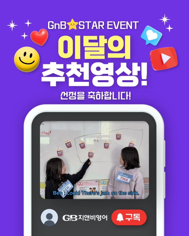 ✨GnB STAR 이달의 영상 선정! ✨ GnB패럴랙스교육 본사에서 진행하는 전국 GnB친구들 영어 영상 이벤트에서 사동캠퍼스 학생들의 영상이 ‘이달의 영상’으로 선정되었습니다! GnB영어는 재미있게 배우고, Role Play를 통해 표현하며 자신감을 키웁니다. 영어를 즐기며 실력까지 성장하는 곳 결과로 증명하는 사동GnB어학원❤️ 사동GnB어학원 문의 811-0042 #사동GnB어학원 #GnB패럴랙스교육 #이달의영상선정 #에밀리선생님 영어는경험이다 RolePlay영어 경산영어학원 영어자신감 <img src="https://blogthumb.pstatic.net/MjAyNjAzMDRfMTg3/MDAxNzcyNjA0NjQxNDcx.sQNpYkoZSfPRTHNq6i0J8lasFIPhkFjJPY6agDqPgKcg.majoPEAOmgf5bULZVqhegXA0UFFQ6ldHCk-iL0_e-9Yg.JPEG/IMG%A3%DF3471.JPG?type=s3" />
