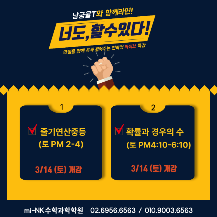 ◆ 줄기연산 중등플러스 ** 중1 연산~중3 연산 (중3 연산에 연계되는 공통수학1 연산 포함) 토 PM 2:00~4:00 (3/14개강, 8회) 교재: NK-줄기연산 중등플러스편 대상: 초등교과과정 마무리 된 학생 ◆ 중등 확률과 경우의 수 ** 공통수학1 경우의 수 연계 내용 포함 토 PM 4:10~6:10 (3/14개강, 8회) 교재: NK-확률과 경우의 수 토탈(T)- MAP 대상: 초등교과과정 마무리 된 학생 수강신청 https://litt.ly/mi_nk <img src="https://blogthumb.pstatic.net/MjAyNjAzMDVfMTc4/MDAxNzcyNjk1MTI3NDE4.AnQAw6GKM54trGG6oxzO8Ji5EUAftevk19a9ipFJ4f4g.JYyT5QcSjIB38TFTm7Vg5ZAdAmYZG1oZ4DJNTWVFGY0g.PNG/%C1%A6%B8%F1%C0%BB_%C0%D4%B7%C2%C7%D8%C1%D6%BC%BC%BF%E4._%2827%29.png?type=s3" />