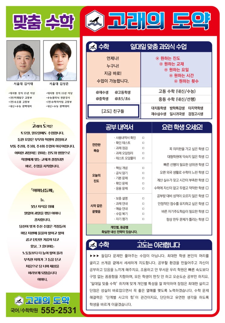 재수는 단순한 반복이 아닌 과목별 학습관리와 전략 설계가 가장 중요합니다. 대치비상은 대형학원의 획일적인 수업 방식이 아닌, 학생별 1:1 상담을 통해 성적·목표·학습 성향을 분석하고 과목별 수업과 자습 비율을 개별 설계합니다. ◆ 개별성적관리형 재수전문종합반(팖Farmm 2.6)시스템-"수업중심의 재수종합반(學)”과 “자습중심의 독학학원(習)”의 장점을 결합한 시스템. ★ 소수정예(6명 내외) 개인별 맞춤 관리★ - 국·영·수·탐 수준별 맞춤 수업 - 학생마다 다른 개인별 시간표 운영 - 1:1 학습 컨설팅 및 생활 관리 - 담당 선생님 직접 자습·문제풀이 점검 - 수학 집중 관리 프로그램 운영 - 수시·정시 입시 컨설팅 제공 ▶ 3월시작반 : 3월 3일(화) 개강 ▶ 상담 및 예약 : 02-525-2599 ▶ 위치 : 한티역 1번 출구 (롯데백화점 3번GATE) *정원 소수 운영으로 조기 마감될 수 있습니다. 재수 방향이 고민되신다면, 1:1 상담을 통해 정확한 전략을 안내해 드리겠습니다.