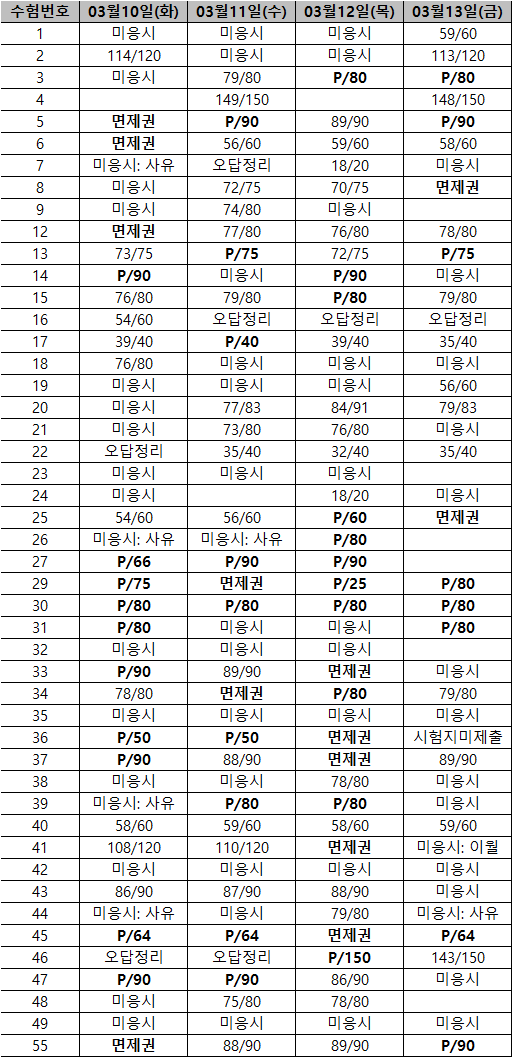 단어시험 문장시험 2026.03.14 단어시험 및 토요일 시험 결과표(임시) 2026.03.14 16:10 기준 결과표입니다. 화요일에 최종 결과표가 업로드됩니다. <img src="https://blogthumb.pstatic.net/MjAyNjAzMTRfMjEg/MDAxNzczNDcyMjIzNTY3.JDI43O2dcDNvg9UptC3vsaY3tNyNVXbES_06Z6T0M9Eg.AbdD1x2-o3SN7sUFwD2sYqnnBNhYx06con82atIyIPMg.PNG/fdfdfdd.png?type=s3" />