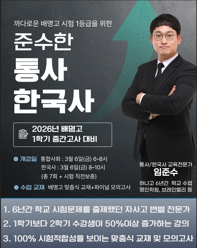 배명고 1학년 한국사 통합 사회 첫 수업이 오늘 시작되었습니다. 배명고에 맞는 통합사회 한국사 수업을 집중 관리합니다. 암기 과목은 수업만으로 해결이 되지 않습니다. 반드시, 1. 수업듣고 2. 복습하고 3. 수업 제공 영상으로 빠르게 복습 4. 배명고만의 실전 테스트!! 그날 그날 영상으로 바로 업데이트 됩니다. 짜투리 시간을 최대한 활용해서 복습하시기 바랍니다. <img src="https://blogthumb.pstatic.net/MjAyNjAzMTNfMTgz/MDAxNzczNDA0NDkzODc3.7Pb_bSpgdhxzOVNWQxZxXJvgiI4XCcBgfgQJTgNE0JYg.WX_8ffHQNZ3q07YMw4vxFAwmcxP_TPuF0grTDym8-NYg.PNG/%C5%EB%C7%D5%BB%E7%C8%B8.png?type=s3" />