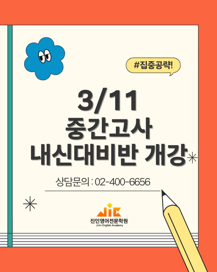 안녕하세요. 송파구 영어전문학원 진인 영어학원 입니다. 2026년 1학기 중간고사 내신대비반 개강일이 확정되어 안내드립니다! 개강일 : 3월 11일 (수) ✔️ 학교별 시험 범위 맞춤 분석 ✔️ 기출·변형·서술형 문제 집중 대비 ✔️ 개별 약점 보완 1:1 관리 시스템 문의 및 상담은 (02-400-6656) 학원으로 연락 주시기 바랍니다. 문의 사항이 있으실 경우 학원으로 연락주시기 바랍니다! 항상 학생들을 위한 최고의 교육과 관리로 보답하는 진인영어학원이 되도록 하겠습니다. 송파구 영어학원 방이동 가락동 오금동 문정동 장지동 위례신도시 영어전문학원 진인 영어학원 진인영어학원 문의: 02-400-6656 <img src="https://blogthumb.pstatic.net/MjAyNjAzMDNfMTI2/MDAxNzcyNTMwNjEyNTQ1.5yYeKIFm6MHmwhF8P_qJbdD_jDWvQ4BHdsTIjOdMrfMg.Oh4D1EFNqEDcDvsdpPYWfVWb_uXj1MRMCnW3z87gkEUg.PNG/%C1%A6%B8%F1%C0%BB_%C0%D4%B7%C2%C7%D8%C1%D6%BC%BC%BF%E4._%289%29.png?type=s3" />