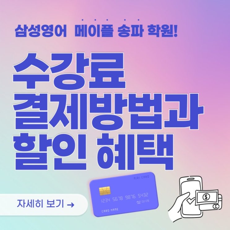 아이의 영어 학습을 시작하거나 학원을 선택할 때 학부모님들이 가장 먼저 궁금해하시는 것이 바로 수강료와 학원 운영 방식입니다~! 수업은 어떻게 진행되는지, 결제는 어떻게 하는지, 할인 혜택은 있는지 등 여러 가지 궁금한 점들이 있으실 텐데요. 특히 요즘 학부모님들 사이에서는 송파동 영어학원 추천을 찾으면서 실제 커리큘럼과 학원 운영 시스템을 꼼꼼하게 확인하시는 경우가 많습니다. 그래서 오늘은 삼성영어 메이플송파에서 운영하고 있는 수강료 안내, 결제 방법, 할인 혜택, 학원 시스템을 한 번에 정리해 안내드릴게요~! 삼성영어 메이플송파 수강료 안내 삼성영어 메이플송파는 학생의 영어 수준과 학습 단계에 맞춰 레벨별 커....... <img src="https://blogthumb.pstatic.net/MjAyNjAzMDVfMTI1/MDAxNzcyNjk1ODk3ODY2.fEz9O10jEgBWwgxPginSK2vFmXlqAdYOnlKbN1KNfREg.n4dCw5RJ-3G3zotyq0tyb6IvDXMWCaJoL7cbp9J_t9sg.JPEG/KakaoTalk_20260304_154401614.jpg?type=s3" />