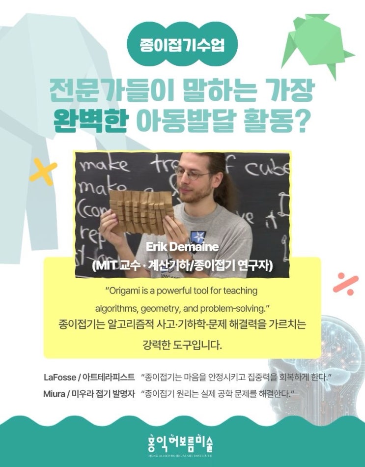 “Origami is a powerful tool for teaching algorithms, geometry, and problem-solving.” MIT 종이접기 연구자인 Erik Demaine 교수는 종이접기를 사고 훈련 도구로 설명합니다. 종이접기는 단순한 만들기가 아니라 알고리즘적 사고와 기하 감각을 동시에 훈련하는 활동입니다. 아트테라피 분야에서도 집중력 회복과 정서 안정에 도움이 되는 활동으로 활용됩니다. 미술이 아니라, 학습 뇌 준비 수업 진주 평거동미술학원인 홍익허보름미술학원의 종이접기 수업은 예쁜 결과물을 만드는 시간이 아닙니다. 생각하며 손을 쓰는 ‘학습 뇌 준비 과정’입니다. 6세부터 초등 저학년까지 연령별 발달 수준에 맞춘 단계형 프로그램으로 설계되어 있....... <img src="https://blogthumb.pstatic.net/MjAyNjAzMDNfMjM4/MDAxNzcyNTI1ODcwMzM4.3eO-F2R_IaxaqHM2YKnz5m5zbpDTjwbUPUD2RyURvd8g.fiewYMxOBII87tWxL4PwmG5QKc-9CESp8Rmf5mFF1t8g.JPEG/%C8%AB%C0%CD%C7%E3%BA%B8%B8%A7%B9%CC%BC%FA_%C0%DA%B7%E1%BD%C7_%BB%E7%C1%F8_20260213_7.jpg?type=s3" />