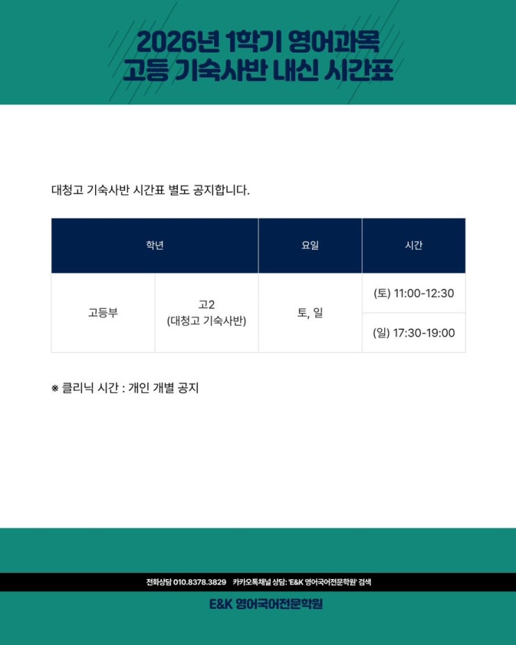 [E&K영어국어전문학원] 고등부 대청고2 기숙사반 시간표