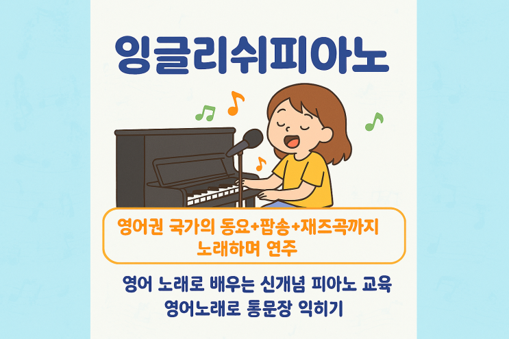 안녕하세요~ 음악으로 행복하게 성장하도록 사랑과 실력으로 가르치는 '스카이피아노'입니다. 오늘은 저희 학원에서 특별히 진행되는 '잉글리쉬피아노'프로그램에 대해 소개합니다~♬ 잉글리쉬 피아노, 영어 레슨인가요? 아니요! 공부가 아니라 '즐거운 연주'입니다. 저희 학원의 잉글리쉬 피아노는 신나는 영어 노래를 통째로 부르면서 피아노를 연주하는 융합형 프로그램입니다. 아이가 직접 건반을 누르며 리듬에 맞춰 영어 가사를 내뱉는 순간, 놀라운 변화가 시작됩니다. '노래하는 잉글리쉬 피아노'만의 진짜 강점 1. "가사를 통째로 외우는 기적" (통문장 암기) 그냥 단어를....... <img src="https://blogthumb.pstatic.net/MjAyNjAzMDVfMTQw/MDAxNzcyNjk4NTQyMzE1.2CNSG3A_0hJTKCSs5DxQanykR_Ry3pM3Itqu2O10yI0g.c3Jl81soXOzeuI2CLaTIzgV9NJn3SSyjThtnQ3gPiX0g.PNG/%C0%D7%B1%DB%B8%AE%BD%AC%C7%C7%BE%C6%B3%EB.png?type=s3" />
