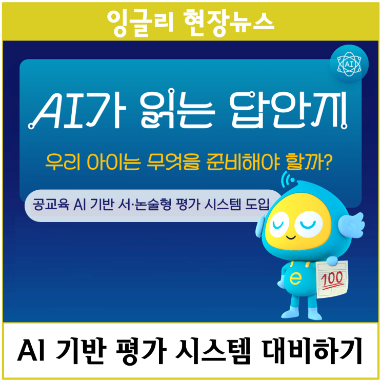 안녕하세요. 잉글리시아이입니다:) 올해 1월, 전국 시·도 교육감은 미래 세대가 반드시 갖추어야 할 핵심 역량으로 비판적 사고와 문제 해결 능력을 강조했습니다. 나아가 이러한 역량이 실제 평가 속에서도 제대로 반영될 수 있도록, 서·논술형 평가를 지원하는 AI 기반 평가 시스템 도입 계획도 함께 밝혔습니다. 그럼 AI가 답안지를 읽는 시대, 우리 아이는 무엇을 준비해야 하는지 잉글리시아이 교육뉴스를 통해 함께 알아보기로 해요! AI 기반 평가 시스템은 학생이 직접 손글씨로 작성한 서·논술형 답안지의 손글씨를 인식하여 답안을 디지털화합니다. 그럼 AI는 학생의 서·논술형 답안을 분석해 맞춤법, 글자 수, 문단 구성과 같은 형식적....... <img src="https://blogthumb.pstatic.net/MjAyNjAzMDVfMTQ3/MDAxNzcyNjg4ODE3Nzcz.7sMJXBpTZwtWjTCRyfOMwuruuk-mYmJj0L-V3Nnla2cg.46j2IpLIBhZjH9VlnMBnoNjBiAD009I7LVQDhEgqDEsg.PNG/%B1%D7%B8%B21.png?type=s3" />