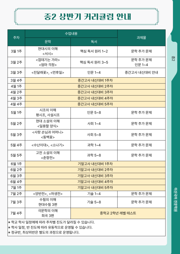 중학교 2학년 상반기 커리큘럼