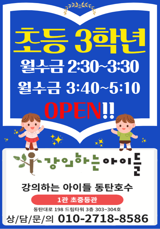 매년 12월에 오픈하던 초등 3학년 수학 수업이 3월 오픈! 그동안 문의 주셨던 어머님들께 기쁜 소식 전해 드립니다 초등학교 3학년 수학 수업이 새롭게 오픈되었습니다. 개념을 쉽고 재미있게 이해하며 수학의 기초를 탄탄하게 다질 수 있는 수업입니다. 체계적인 학습으로 자신감을 키우고 문제 해결력을 함께 길러줍니다. 수학이 즐거워지는 시간, 지금 함께 시작해 보세요! 문의 및 상담은 언제든지 환영합니다. ✨ [초중등 영어수업 오픈] - 다년간 학교와 학원에 영어 수업 진행 - 문법 설명을 가장 쉽고 빠르게 진행하는 문법잡기 - 영어 공부를 효율적으로 복습하는 체계화 작업 단기간 가시적인 학습 성과 지금이 가장 빠른 뿌리 내....... <img src="https://blogthumb.pstatic.net/MjAyNjAzMDVfMjU3/MDAxNzcyNjk3Mzc2NzM1.vKZZq1FUoRVGnz2jxkkDLCkeIol4yDeEbF9C72yXDMIg.4lyZJgvg7gqUGN0gIIt2kA-FXdQLSmrQJ6yo2Fm4OfEg.PNG/%C3%CA3.png?type=s3" />