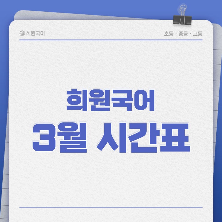 안녕하세요. 희원국어입니다. 겨울의 끝자락에서 더 따스한 내일☀️을 위해! 희원국어도 분주한 3월이 시작되었습니다. 초등중등고등 다시 이어지는 여정을 함께 하기 위한 3월 시간표를 알려드립니다. 초등부 3월 시간표 청계관(중등/고등) 3월 시간표 영천관(중등/고등) 3월 시간표 자세한 내용은 아래 이미지를 통해 확인해주세요! * 문의사항은 카카오채널 또는 학원으로 연락 부탁드립니다. * 희원국어 초등부 ‼️주 2회 수업으로 진행됩니다. 희원국어 청계중등관 희원국어 청계고등관 ❗중앙고2 토 10시 수업은 마감되었습니다. ❗고3 화작반은 마감되었습니다. 희원국어 영천....... <img src="https://blogthumb.pstatic.net/MjAyNjAzMDZfMTU1/MDAxNzcyNzk5Njg1NzQz.9_ft9uMglyIdW5v2zkThdaKbdIqrHLeKD1qGoxYmzd8g.B7ZWiEg1FN-eD9xuIWEueQTboAjyppVAXoUAvXulzjkg.JPEG/%BD%C3%B0%A3%C7%A5_%B4%EB%C7%A5.jpg?type=s3" />