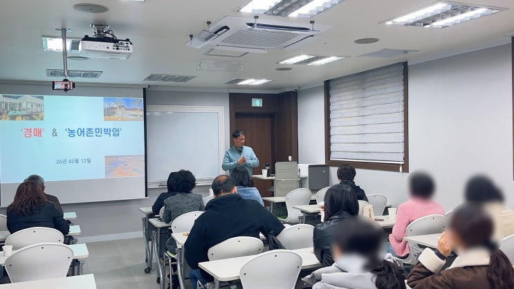 안녕하세요~울산 경매학원 위드 울산캠퍼스입니다^^ 저번달에는 주거용 부동산 수업을 해주셨는데~3월에는 이채웅 소장님께서 경매 낙찰 후 농어촌 민박 사업까지, 실전 강의 이야기 해주실꺼에요~! 수업 자료는 이메일로 보내드리고 있는거 알고 계시죠~?! 잘 확인해주세요 전문가 132기 회원님께서 일찍 오셔서 임차권 등기 관련으로 부원장님과 잠깐 이야기 중 농어촌 민박업을 먼저 소개시켜 주셨습니다. 농어촌 민박업은 농어촌 비역 주민이 자신이 거주하는 주택을 이용하여 방문객에게 숙박, 음식, 농촌 체험 등의 서비스를 제공하는 사업이라고 하시면서 농어촌지역주민 소득증대와 농어촌관광활성화를 통한 지역활력 증진이 목적이며 특....... <img src="https://blogthumb.pstatic.net/MjAyNjAzMTJfMTE2/MDAxNzczMzExMjA4MTA5.FD8NQQs-POdWnM18ZUrhOt96RF2eDNRlfw7aWI5w9mwg.bVMMVF_h3BXuLmx_albGam7ZVX3HBOMmVWuy74MByfwg.JPEG/6.jpg?type=s3" />