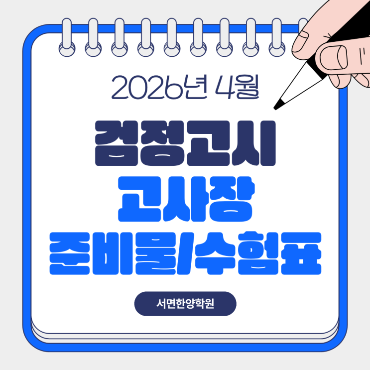 안녕하세요~ 대입전문 서면한양학원 입니다^^ 검정고시 시험일이 이제 한달도 채 남지 않았어요~ 수험생 여러분 모두 마무리 잘 하고 계시죠?!!^^ 오늘은 2026년 4월 전국 검정고시 시험이 치뤄지는 고사장을 안내해 드릴게요. 온라인 접수시 검정고시 시험장을 선택하셨을 텐데요 기억이 잘 나지않는다면,수험표를 확인해보시면 됩니다^^ 원서접수 시 지정한 고사장은 변경이 불가합니다! 수험표 온라인 출력방법은 아래 다시 전달드릴게요~!! 각 지역 검정고시 시험장소는 지역별 교육청 홈페이지 검정고시 공고에서 확인이 가능합니다! 2026년 4월 검정고시 수험표출력 온라인 접수자의 경우 2026년 3월 20일(금)부터 아래 누리집 사이트에서....... <img src="https://blogthumb.pstatic.net/MjAyNjAzMTJfMTQx/MDAxNzczMjk1MjQ5NDc3.s_TpSlyyfQcog9BtsaVyqQOjy2yHMoSUp5SigceaLkkg.2o2uDeysQQ2aBiLKXwUu_HrSecWP3qqjSKJlCO-q1SIg.PNG/%C1%A6%B8%F1%C0%BB_%C0%D4%B7%C2%C7%D8%C1%D6%BC%BC%BF%E4._%285%29.png?type=s3" />