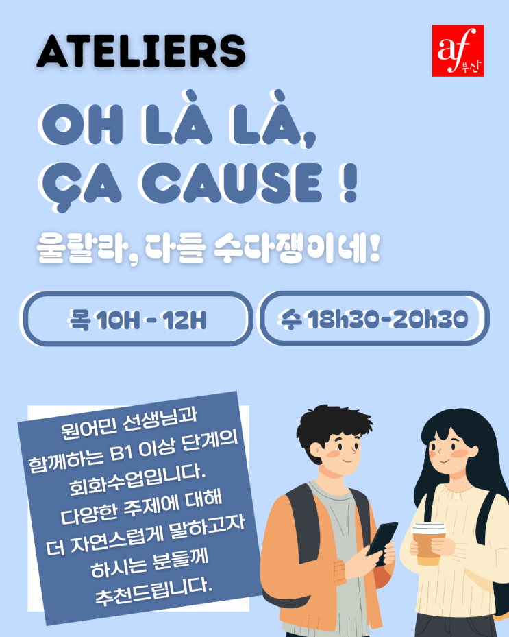 안녕하세요. 부산 알리앙스 프랑세즈입니다 원어민 선생님과 일상적인 주제로 자유롭게 대화해 보고 싶으신가요? 그렇다면 저희 회화 수업 《Oh là là, ça cause !》에 참여해 보세요! 이 수업은 B1 이상 수준의 학습자를 대상으로 하며, 매주 다양한 주제를 바탕으로 토론 중심의 수업이 진행됩니다. 선생님이 여러분의 관심사와 학습 목표에 맞춰 주제를 조정해 드려요. 안녕하세요, 수요일 18:30~20:30 목요일 10:00~12:00 주 1회 수업으로 프랑스어 회화 실력을 키워보세요! 프랑스인 선생님과 함께 자연스럽게 프랑스어 회화를 향상시키고 싶은 분들께 추천드립니다 부산 알리앙스 프랑세즈 문의 및 등....... <img src="https://blogthumb.pstatic.net/MjAyNjAzMTRfMTE2/MDAxNzczNDczMzkwNjEy.IpvgaHLZVh6uy-xNV5ACJ1FcaVR6ZVoNxhxdh_NN_Hwg.2s2_lflncVFxI4AsZO0X7uuetYE9xQLEQHKHho1jNtcg.PNG/visuel_de_cours_de_novembre__Seonghyun.png?type=s3" />