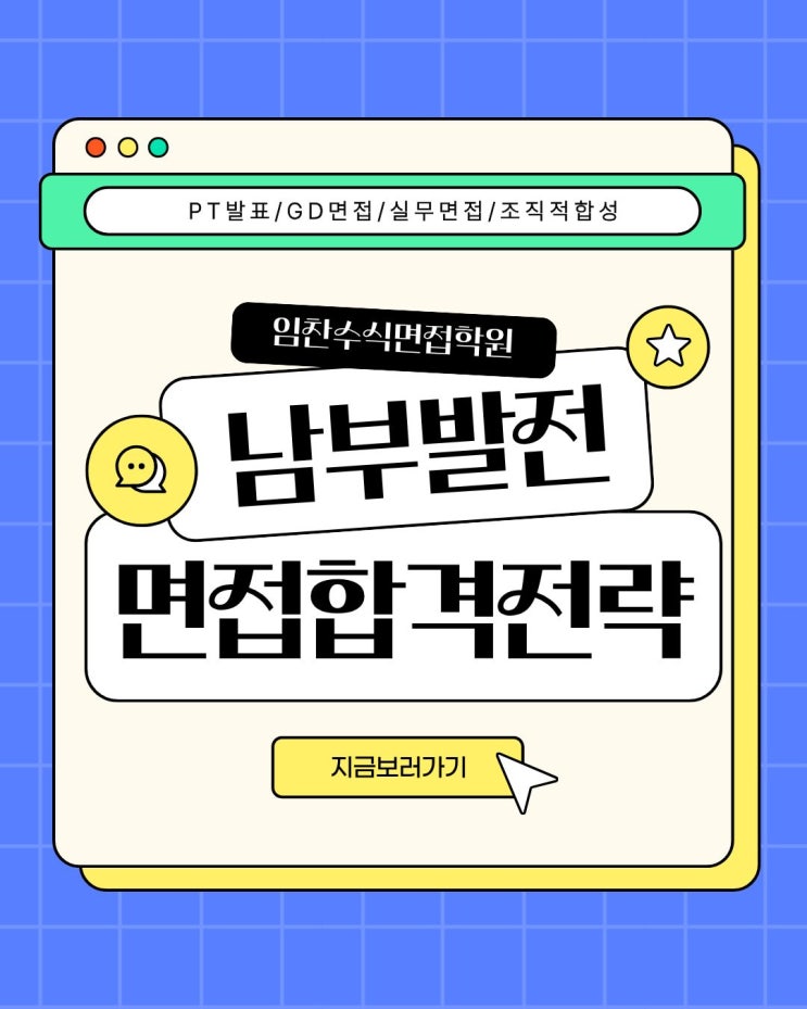 안녕하세요. 임찬수식 면접학원입니다. 최근 한국남부발전 2026년 상반기 신입사원 채용공고가 발표되면서 많은 취업 준비생들의 관심이 집중되고 있습니다. 발전 공기업을 목표로 준비해 온 분들이라면 이번 채용을 중요한 기회로 보고 계실 텐데요. 한국남부발전 채용은 필기전형 이후 NCS 기반 역량면접을 통해 최종합격자가 결정되는 구조로 진행됩니다. 특히 면접에서는 발표(PT), 토론, 직무 및 인성 평가가 종합적으로 이루어지기 때문에 단순한 면접 준비만으로는 대응하기 어렵습니다. 오늘 글에서는 한국남부발전 면접의 특징과 실제 준비 방법, 그리고 임찬수식 면접학원의 남부발전 면접 대비반과 전략에 대해 자세히 안내해드리겠습....... <img src="https://blogthumb.pstatic.net/MjAyNjAzMTFfODAg/MDAxNzczMjE2NzYwMDA4.RMJxldOef74Qt-bS81JJtJWb3EJ1fM7m01MMFirlJkcg.Q2vJIThNi0xoJG-2KVEy6N0Tf78P69qzSwdhefADKVAg.JPEG/%B3%B2%BA%CE%B9%DF%C0%FC_%C6%CB%BE%F7.jpg?type=s3" />