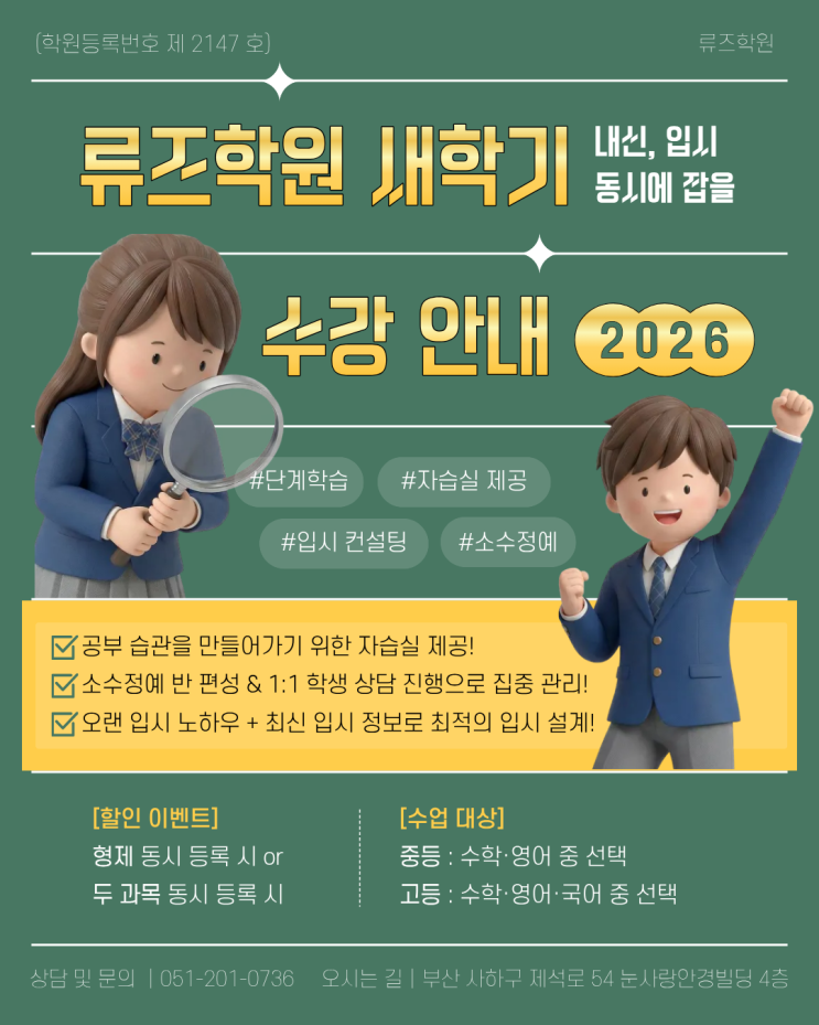 안녕하세요, 류즈학원입니다 :) 류즈학원이 새학기를 맞이하여 신입생을 모집하고, 새학기 강의를 개설했습니다 ~! 가장 중요한 이 시기에 류즈학원에서 탄탄히 기초를 잡고 내신과 입시를 동시에 잡아봅시다! 류즈학원은 무조건적인 암기 방식이 아닌, 이해하고 응용할 수 있는 방향으로 수업을 진행합니다. 모르는 것은 편하게 질문할 수 있도록 하며, 가족같은 편안한 분위기가 조성되어 있기에, 무엇보다 학생을 우선으로 하는 류즈학원입니다. ♡ 류즈학원은 오랜 기간동안 학원을 운영해오며 쌓인 입시 노하우와, 최신 입시 정보를 적극적으로 반영하고, 뿐만 아니라 미래의 입시 경향을 파악하기에 학생들에게 최적의 입시 방향과 공부법....... <img src="https://blogthumb.pstatic.net/MjAyNjAzMTJfMTIy/MDAxNzczMzA0ODg5Mjc2.WrRhWTyD0EwosGHRmTWhPRhCUMDQPr1-WuCEr-Usubwg._peOklPYKaqazuy3K7wcd2JXhhDukiPpwi2ZrP7R3_Ag.PNG/%C1%A6%B8%F1%C0%BB_%C0%D4%B7%C2%C7%D8%C1%D6%BC%BC%BF%E4._%2811%29.png?type=s3" />