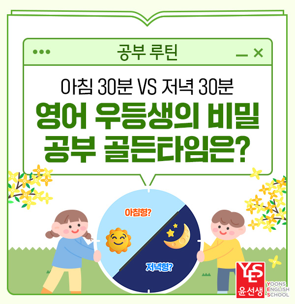 영어 공부는 몰아서 하는 것보다 매일 꾸준히 노출하는 '루틴(Routine)'이 생명인데요. 윤선생 학습의 가장 큰 장점은 정해진 시간에 규칙적으로 학습하며 자기주도학습 습관을 기른다는 점입니다. 그렇다면 우리 아이는 하루 중 언제 공부하는 것이 가장 효과적일까요? 오늘은 아침공부와 저녁공부의 장점을 소개하고 윤선생 학습 루틴 전략을 공개합니다! 우리 아이가 아침형이라면? 상쾌한 뇌로 윤선생 공부 시작! 아침 기상 후 등교 전까지의 시간은 뇌가 가장 맑고 방해 요소가 적은 시간입니다. 특히 윤선생은 '따라 말하기' 방식으로 자기주도학습이 진행되기 때문에 큰 소리로 영어를 뱉으면서 뇌 혈류량이 늘어나 잠....... <img src="https://blogthumb.pstatic.net/MjAyNjAzMDNfMjA0/MDAxNzcyNTA0NDM2Nzkw.Ja3oJIx2m6Z-FVSzAQNVfC-jRkxTxoDnJMI-WjZq48gg.b53LyjInbpVtKbzY2Hy_Hz2GVo3sIzRzUyX7JutYb-kg.JPEG/yoons-study-secret-thumb-blog.jpg?type=s3" />