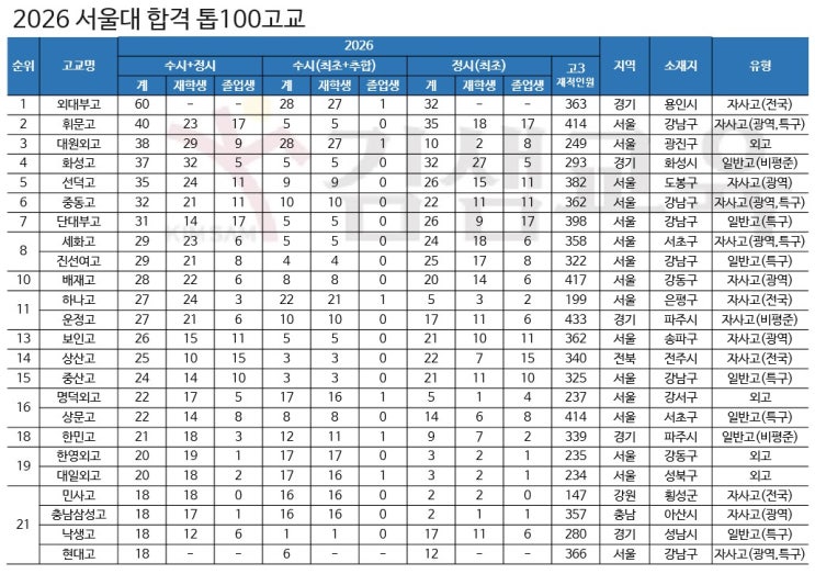 2026 서울대 합격 톱100고교