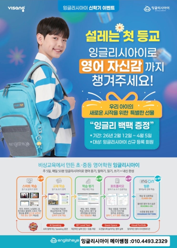 안녕하세요^^ 메이쌤입니다. Ta-da! 비상 잉글리시아이에서 신학기를 맞아 신입생을 위한 선물이벤트를 하고 있네요^^ 우리 친구들 모두가 이 예쁜 스카이블루빛깔의 백팩을 메고 다니면 얼마나 깜찍?듬직?하고 멋질까요^^ 현재 이벤트 기간에 등록해준 신규생들이 있어서 먼저 가방 증정식을 하고 이벤트 기간 직전이나 직후에 들어오는 친구들에게도 혜택을 줘야할 것 같아요^^ 모두들 환영합니다. 그래서 정리해 봤어요^^ 잉글리시아이메이쌤의 특전! 1. 신입등록 전 무료상담과 무료 레벨테스트, 무료 체험수업을 1시간 진행!! 모든 학생은 첫 등록시 필기도구와 필통, 교재, 노트, L자파일, 학원가방 일체를 제공받게 됩니다. 특히, 교재는....... <img src="https://blogthumb.pstatic.net/MjAyNjAzMTNfMTY3/MDAxNzczMzM1NzEzMTYy.5Cnbx4nDDXFk2ngqUdivpjAKVUSmDEj-_GSKCUuRT8Qg.6aNVtirTQt9ec44IIsuqGBJf51HQjsG79qpG9j7ORD8g.JPEG/%B9%E9%C6%D1%C0%CC%BA%A5%C6%AE.jpg?type=s3" />