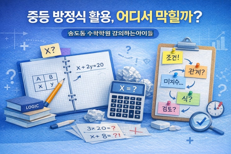 1) 우리 아이, 지금 어디에서 막히고 있을까요? (진단 체크리스트) 방정식 활용(문장제)이 유독 어렵다면, 먼저 아래를 체크해보세요. 아이가 2개 이상 해당되면 ‘풀이량’보다 논리력 훈련이 먼저일 가능성이 큽니다. ✅ 식을 세웠는데 자주 틀린다(조건 누락/관계 오류) ✅ x를 뭘로 둬야 할지 매번 헤맨다 ✅ 문제를 두 번, 세 번 읽어도 핵심이 안 잡힌다 ✅ 서술형에서 설명이 끊겨 감점이 많다 ✅ 답은 맞아도 왜 맞는지 말로 설명을 못 한다 이런 경우 단순 반복풀이로는 시간이 오래 걸립니다. 그래서 송도동 수학학원 강의하는아이들은 방정식 활용을 “풀이량”보다 논리력 수업으로 먼저 잡습니다. 2) 왜 ‘논리력’이 방정식 활용을....... <img src="https://blogthumb.pstatic.net/MjAyNjAzMDVfNDkg/MDAxNzcyNjkxNzc5NDA2.Be_neAwMvYTzpAleyBILz_WYtrf_g3KMf2aunf4rXK8g.26sYwqkGP9TXLgbD0U0uypNXujfMYkzUVlBfrHQdjKAg.JPEG/a3.jpg?type=s3" />
