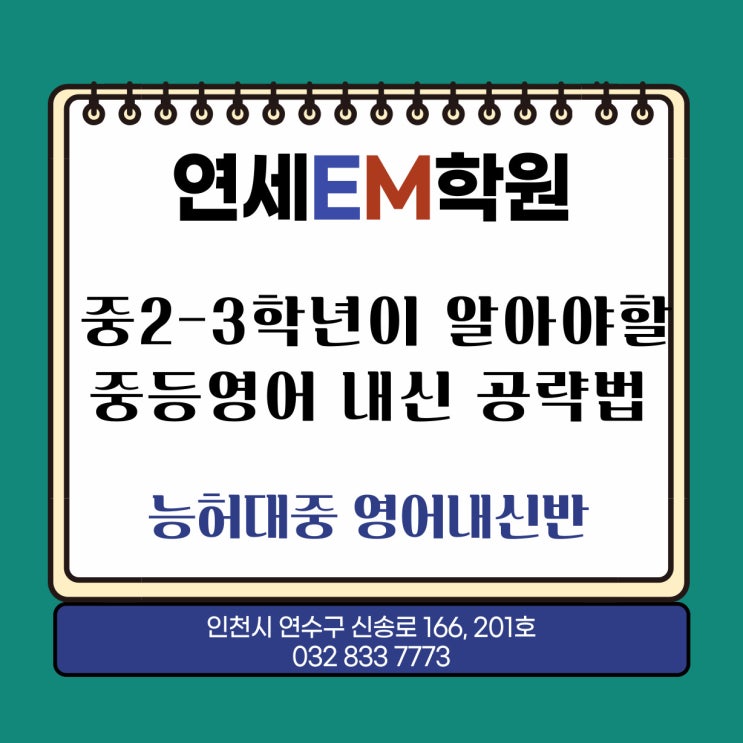 능허대중 영어 출제 능허대중학교 영어시험 능허대중 영어학원 능허대중학교 학원 송도 중학생이 알아야할 영어 시험 공략법 : 중하위권 대상 송도 능허대중 영어선생님의 내신 출제 스타일 안녕하세요. 능허대중 학부모님과 학생 여러분 송도1공구 학원중심가 8년간 한자리에서 영어 교육 전문 연세EM학원입니다. 영어시험만 보면 많이 위축돼요 단과학원도 종합학원도계속 다니는데 성적은 안올라요 - 송도 내 중학생 인터뷰 이말은 말 뒤에 실력보다 자신감이 많이 떨어진 경우가 많습니다. 중1 실력에 갇히지 않고, 자신감 회복을 돕고 학생의 수준, 공부 습관, 학교 일정에 맞춘 맞춤지도로 향상 될 수 있다는 생각을 만들어드리겠습니다 능....... <img src="https://blogthumb.pstatic.net/MjAyNjAzMDNfMjk0/MDAxNzcyNTQ4Njc0Mjky.HBD_j-c1rb6m3ONYimVSsCRw1j4TPD4zrAKEliNar04g.0hh4TySBdkqUapBhVMenpipOTks0AFTNfr86wxOkHlIg.JPEG/%B4%C9%C7%E3%B4%EB%C1%DF_%BF%B5%BE%EE%C7%D0%BF%F8_%282%29.jpg?type=s3" />
