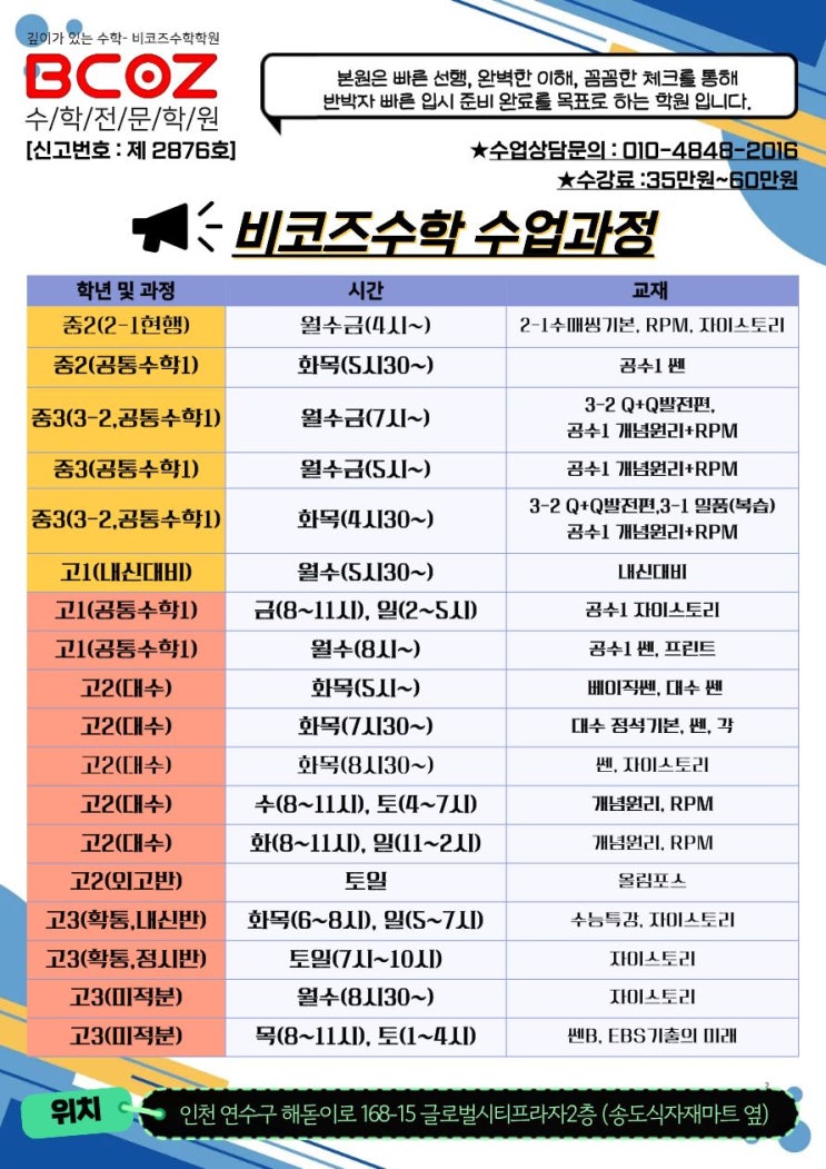 수학 전문학원 클라비스교육학원 초중등부 3월~5월 시간표안내