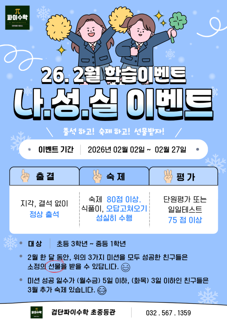 안녕하세요 검단 파이수학 초중등관입니다. 파이수학에서는 학생들이 단순히 문제만 푸는 공부가 아니라 좋은 공부 습관을 만들 수 있도록 다양한 학습 이벤트를 진행하고 있습니다. 지난 2월 한 달 동안 진행된 이벤트는 바로 ⭐ 나.성.실 이벤트⭐였습니다! 나.성.실 이벤트란? 나.성.실은 ✔ 나 : 나이스한 출석 지각, 결석 없이 성실하게 출석하기 ✔ 성 : 성실한 숙제 숙제 80점 이상 + 식풀이 + 오답고쳐오기 ✔ 실 : 실력 있는 평가 단원평가 또는 일일테스트 75점 이상 이 3가지 미션을 모두 성공하면 이벤트 카드에 도장을 받을 수 있는 학습 이벤트입니다 이벤트 기간 2026년 2월 2일 ~ 2월 27일 대상 초등 3학년....... <img src="https://blogthumb.pstatic.net/MjAyNjAzMTBfMjg1/MDAxNzczMTI3NjY0ODgx.MDF6L6jLj_5SwmQrQjdkT4N0MjDugFpQXvBc5-7VzyYg.gd2V_J1CJH0vl2_vbsJjFXHqcoOpVPNgHhoruHu9DrAg.PNG/KakaoTalk_20260310_161606918.png?type=s3" />