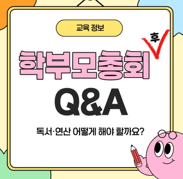 이웃님들 안녕하세요~❤️ 봄 기운에 기분이 더더 좋아지는 날입니다. 지난주, 이번주 학부모 총회 잘 다녀오셨죠? 요즘 학부모님들과 이야기하다 보면 가장 많이 듣는 질문이 있습니다. “선생님이 독서 중요하다고 하셨는데… 어떻게 해야 하나요?” “매일 읽기 하라는데, 어느 정도 해야 할까요?” “연산은 꾸준히 하라는데… 얼마나 시켜야 하나요?” 특히 학부모 총회 다녀오신 이후이 고민이 더 커지신 분들이 많으실 거예요. 그런데 여기서 중요한 포인트가 있습니다. 학교에서는 ‘방향’을 알려주지만 집에서는 ‘방법’이 필요하다는 것! ❗ 대부분 여기서 막히게 됩니다 많은 어머님들이 이렇게 시작하세요. 책을 많....... <img src="https://blogthumb.pstatic.net/MjAyNjAzMjBfMTQ1/MDAxNzczOTk0NTM0NDcx.gL6X_qnmV4t5quRMJaRxMLYGRPaO2CWNqgID8ovR09Ig.elE68cJLG973FFhuOPvoC_k6NckSL-_ZUGf2xHRjALog.JPEG/%BF%F5%C1%F81.jpg?type=s3" />