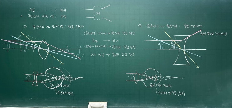 아이들이 “렌즈”를 배우기 시작하면 처음엔 그림이 복잡하고 어렵게 느껴집니다. 하지만 이 단원은 암기가 아니라 빛이 어떻게 움직이는지 이해하는 과정입니다. 중2 과학, ‘빛의 굴절과 렌즈’ 교과서에서 배우는 핵심은 명확합니다. 빛은 매질이 바뀌면 꺾인다 (굴절) 렌즈는 이 굴절을 이용해 상을 만든다 수업에서 다룬 핵심 정리 칠판 수업에서는 두 가지 렌즈를 중심으로 정리합니다. ① 볼록렌즈 ✔ 빛을 한 점으로 모은다 ✔ 물체 위치에 따라 상이 달라진다 가까울 때 → 확대된 정립 허상 멀어지면 → 도립 실상 (확대 또는 축소) ② 오목렌즈 ✔ 빛을 퍼뜨린다 ✔ 항상 → 축소된 정립 허상만 만들어진다 ....... <img src="https://blogthumb.pstatic.net/MjAyNjAzMjlfMTI1/MDAxNzc0NzQ3ODE3MzQz.agGVPce4YEHu_rfeLQwqEmDCfZie6RoeZEWXLZ-fiFUg.j8LSn8JD1b81tdcAUdPx9OsvDawE6FthHOxcWftZCYYg.JPEG/3.29_%BA%ED%B7%CE%B1%D7.jpg?type=s3" />