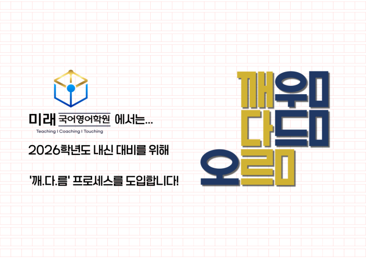 안녕하세요! 미래국어영어학원 국어과입니다. 26학년도 내신부터 도입 및 적용되는 저희 미래 국어과만의 내신대비 시스템! '깨.다.름' 프로세스를 소개합니다! 저희 미래국어영어학원에서는 지난 십수년간의 노하우를 담아, '주말 정규 수업 + 주중 클리닉 (서술형 문항 중심 과제 수행 후 선생님과의 일대일 대면 관리)'이라는 학습 체계를 구축해왔습니다. 또한 매년 학생들의 수준과 성향, 학교 출제 경향 등을 고려하여 여러 학습 컨텐츠를 개발 및 적용하여 재원생들의 실질적인 성적 향상 및 높은 수준의 성취감을 실현해왔습니다. 재작년부터 도입했던 실전 모의고사는 작년 2학기 '오마주 테스트'로 이름....... <img src="https://blogthumb.pstatic.net/MjAyNjAyMTFfMjQy/MDAxNzcwNzYwMTY5NDM0.MyVDBQDaOsBYj7B-9DVLDRT5CuCe54Pn_X-wSZHeJWAg.YEX-hC_OBbF2jDLs6nSuY9J6cAWIVumoJjOk3nblhdkg.PNG/001.png?type=s3" />