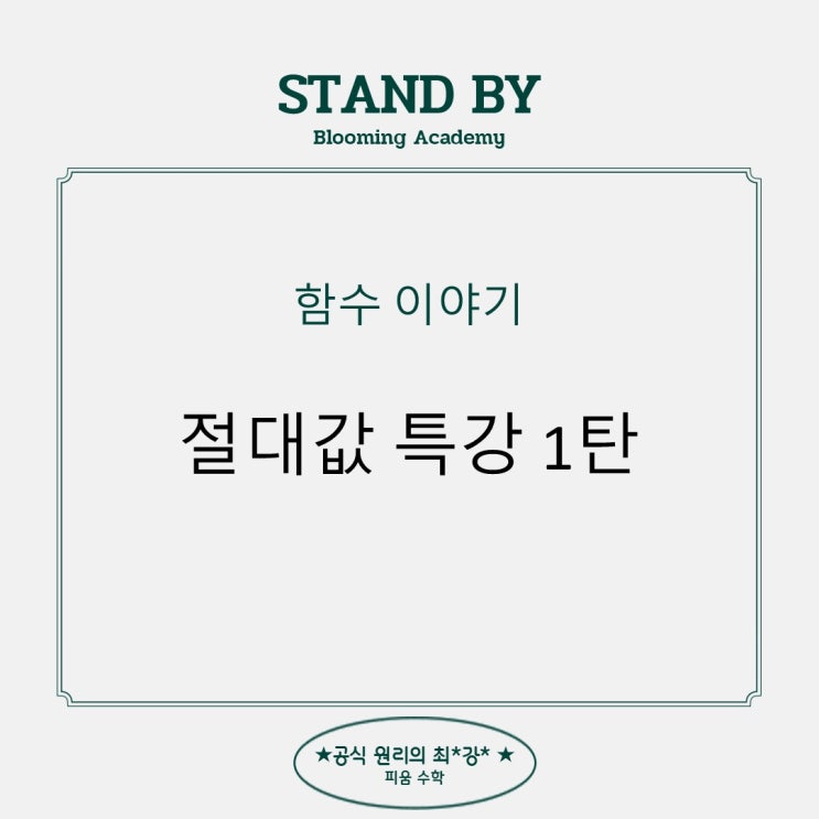 수학에서 절댓값이라는 개념은 중1 때 처음 배우게 되는데 절댓값만 나오면 어려울 거라는 생각에 시작부터 걱정이 앞서게 됩니다. 그래서 절댓값에 대한 기본 개념과 함수에서의 절댓값의 상황별로 정리해 볼게요!! 기본적인 절댓값의 의미 절댓값의 의미는 설명하기를, 수직선에서 원점(0)으로부터 떨어진 거리를 의미합니다. 거리는 음수(-)가 없어요. 그래서 무조건 0보다 크거나 같습니다. 거리는 음수가 없다는 말은, 일반적으로 길이를 젤 때 쓰는 자를 생각해 볼까요? 자에 음수가 있나요?? 0부터 시작입니다. 그런 의미로 보면 됩니다. 그래서 절댓값의 결과는 무조건 0이거나 양수입니다. 함수에서의 절댓값의 의미 함수는 결국 그래프....... <img src="https://blogthumb.pstatic.net/MjAyNjAzMTdfMjE5/MDAxNzczNzQyOTQ1NzI1.ur4J8pTzh6-Ox0oxrqDwOT7-KvoelYnrTBdX6m05Qywg.z0CjKu2qL4d1iZSn3rfVuC0e-CSzYF4t-3fRF9uptnsg.JPEG/1.jpg?type=s3" />
