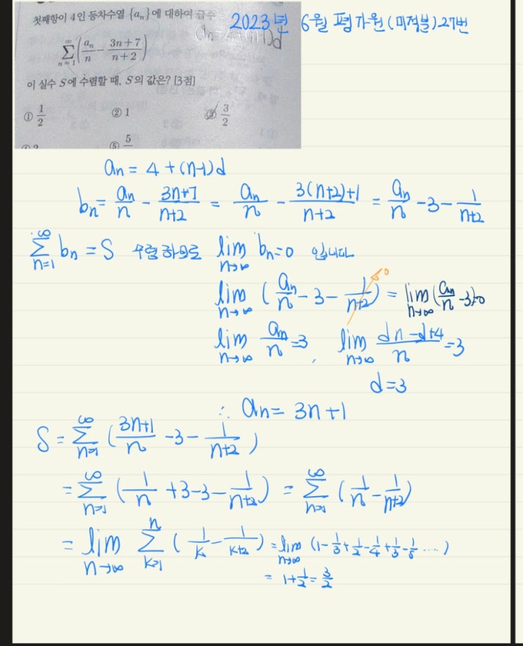 수열의 극한과 급수, 구조로 이해하는 지호학원 수업 고등 수학에서 많은 학생들이 어려워하는 단원 중 하나가 수열의 극한과 무한급수다. 계산은 할 수 있어도, 왜 수렴하는지 설명하지 못하는 경우가 많다. 최근 지호학원에서는 2023년 6월 평가원 모의고사 미적분 27번 문제를 활용해 등차수열과 급수가 결합된 고난도 유형을 집중적으로 다뤘다. 이 문제는 단순 계산 문제가 아니라, 급수가 수렴하려면 어떤 조건이 필요한지 일반항의 구조를 어떻게 바꿔야 하는지 를 정확히 이해하고 있어야 해결할 수 있는 문항이다. 수업에서 다룬 핵심 접근 문제의 핵심은 첫째항이 4인 등차수열이 주어졌을 때, 다음 형태의 급수가 수렴....... <img src="https://blogthumb.pstatic.net/MjAyNjAxMjZfMTgy/MDAxNzY5NDM0NTg0ODQy.wJaUq496vQZ0M3u0aIGwYBqIpRzSXpNQpXN6FLh7M3Eg.zpYufQMhbk1kiC3L2_41L2TsN9emz4H6Oct4QU0BojIg.JPEG/900%A3%DF1769312264662.jpg?type=s3" />