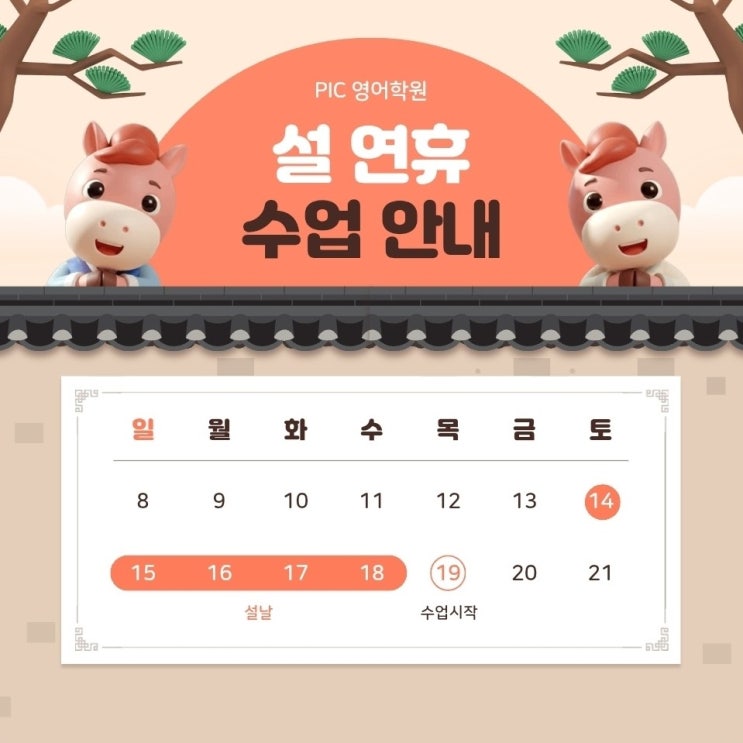 안녕하세요, P.I.C 영어학원입니다! 설 연휴로 인해 아래 기간동안 학원이 휴원합니다. 설 연휴 휴원 기간 2월 16일~ 18일 연휴 이후에는 아이들 리딩 루틴이 자연스럽게 이어질 수 있도록 19일부터 수업을 시작합니다! 가족과 함께 따듯하고 즐거운 설 연휴 보내세요~ <img src="https://blogthumb.pstatic.net/MjAyNjAyMDVfMjgz/MDAxNzcwMjc0NTI1Njk2.XmflqRDdCshSWODAZBfqNGrDJ7cU0r_z4rjUfr6TiDAg.uaAZkxcu7c-0JgTUn-2tAlFJggLCWHkK4biBn34vqQwg.JPEG/KakaoTalk_20260204_171758446.jpg?type=s3" />