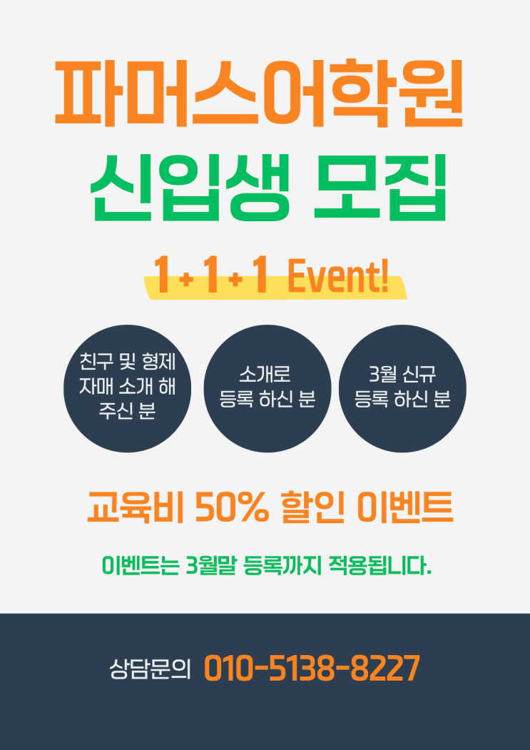 안녕하세요 이천송정동 파머스어학원입니다. 3월 신학기를 맞이하여 신입생을 모집하고 있습니다. 더불어, 세미나와 수업 연구 준비에 신경을 많이 쓰느라 홍보를 많이 하지 못해 기존 학부모님과 신규 학부모님 모두 에게 혜택을 드릴 수 있는 홍보 및 이벤트 방법을 고민하다가 이천 파머스 송정캠퍼스 창립 이후 최대로 파격 적인 교육비 50프로 할인 이벤트를 3월 한달 간 진행 하기로 했습니다.!!! <제 1333호> 앞으로도 체계적인 커리큘럼과 꼼꼼한 학생관리로 우리 파머스 친구들 정성껏 지도 하겠습니다. <눈높이 건물 5층에 파머스어학원 있습니다.> <img src="https://blogthumb.pstatic.net/MjAyNjAzMDJfMjg1/MDAxNzcyNDQ2NjQ5OTY2.cZ5GHVkO4eDvuM0E6SJtqEt3BCeE2zpfl3NpP81iug0g._7JYQsk0uCTPvm9osSdBdU-mBQZKuzjUHAffHaCsHKgg.PNG/%C6%C4%B8%D3%BD%BA%BE%EE%C7%D0%BF%F8.png?type=s3" />