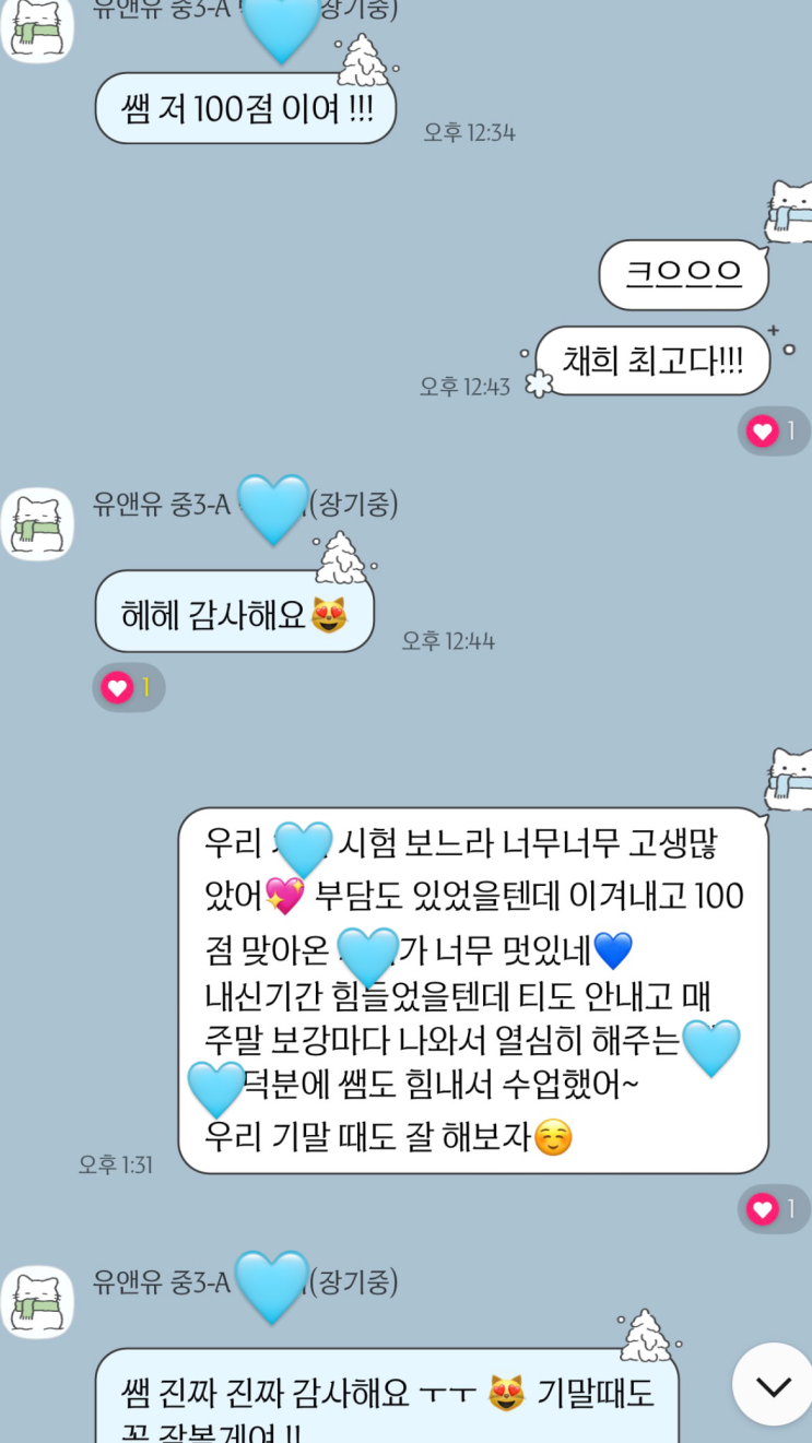 안녕하세요 유앤유 초중등부 김정연T입니다. 제 보석함 안에는 소중한 아이들의 이야기가 가득 들어있습니다. 앞으로 하나씩 이야기 보따리를 풀어보려 하는데, 오늘은 장기중학교 전교 1등의 이야기를 해보고자 합니다. 중학교 1학년 때 박00 학생을 처음 만났습니다. 열정 가득한 두 눈이 아직도 또렷이 기억납니다. 박00 학생은 처음 입학했을 때부터 끈기와 열정, 실력까지 전교 1등의 자질을 갖춘 학생이었습니다. 그래서 많은 분들이 “원래 잘하는 아이였겠지.”라고 생각하실지도 모르겠습니다. 하지만 3년 동안 가까이에서 지켜본 저는 전교 1등은 ‘한 번 하는 것’보다 ‘계속 유지하는 것’이 훨씬 어렵다는 사실을 알게 되었습니다....... <img src="https://blogthumb.pstatic.net/MjAyNjAyMjdfMTAw/MDAxNzcyMTg5NTMyMjM2.HrxOXYaXG4_SPWLp2bAu47HAvyXw-dC24ZBc0Fay9Fog.9kvaVY1SI8xr2aeIn0V1pRSftImf77Ano2gTls7NSPUg.PNG/image.png?type=s3" />