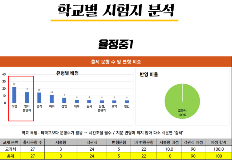 안녕하세요 옥정공감학원 입니다! 오늘은 학교별 시험지 분석을 가지고 왔습니다. 지기지피 백전백승(知己知彼 百戰百勝) 적을 알고 자신을 알면 백 번 싸워도 위태롭지 않다 적을 알아야 나를 대비할 수 있듯이, 시험도 마찬가지죠. 우리 학교의 시험 출제 스타일을 알아야, 대비방법이 나옵니다. 그 첫번째 타자로, #율정중! 입니다. 챠라~! 이렇게 한 문항 한 문항 지문과 비교하여 통계를 내보았는데요~ 정말 오랜시간이 걸렸습니다 귀중한 자료인 만큼, 유익한 정보 꼭! 얻어가시길 바랄게요! 율정중은 신설 학교이기 때문에 아무 정보가 없습니다 ㅜㅠ 즉, 데이터가 많이 없다는 뜻이죠 그러나 긍정적인 관점으로 본다면, simple 심....... <img src="https://blogthumb.pstatic.net/MjAyNjAxMDlfMjU5/MDAxNzY3OTQ5OTY4OTQ1._0sDKg-e-HFsv5KT2WpSvwHmAHtVO6lLzIS56wbbDswg.fDoDULXL7RXlsT47hE-mWi6F4Gt34838dMb-uotWg9Ag.PNG/%BD%BD%B6%F3%C0%CC%B5%E53.PNG?type=s3" />